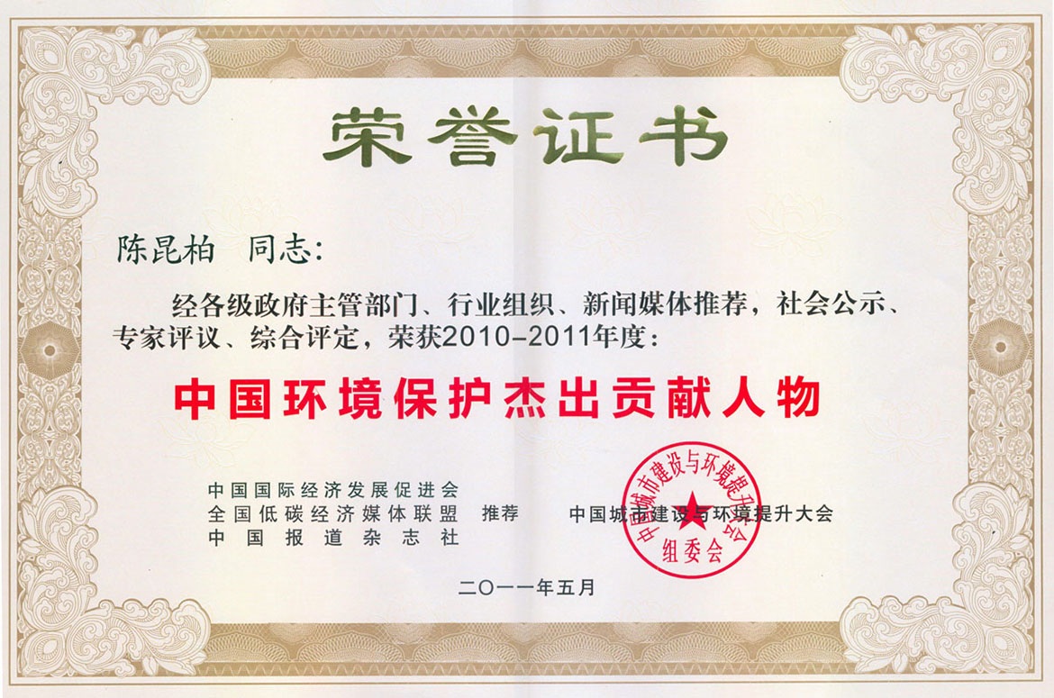 經各級政府主管部門、行業(yè)組織、新聞媒體推薦,社會公示、專家評議、綜合評定,陳昆柏同志榮獲2010-2011年度“中國環(huán)境保護杰出貢獻人物”