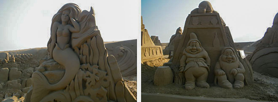 “沙雕故鄉、度假天堂”說得就是我們第一個到達的目的地:舟山朱家尖。朱家尖有清新、歡快的--海洋之旅;飄逸、灑脫的--休閑之旅;健康、明朗的--康體之旅。懷著這樣的憧憬,放下行李我們迫不及待的想去體驗。果然,美輪美奐的沙雕景象,沖擊你的視覺體驗。走進以迪士尼卡通人物為主題的沙雕樂園里,帶你回到孩提時天真時代。現在就用照片跟大家一起分享我們的快樂。