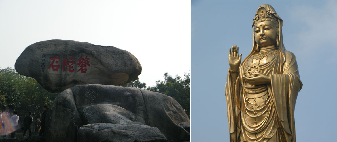 島四周金沙綿亙、白浪環繞,漁帆競發,青峰翠巒、銀濤金沙環繞著大批古剎精舍,構成了一幅幅絢麗多姿的畫卷,給人完美的視覺體驗。巖壑奇秀,磐陀石、二龜聽法石、心字石、梵音洞、潮音洞、朝陽洞各呈奇姿,引人入勝。