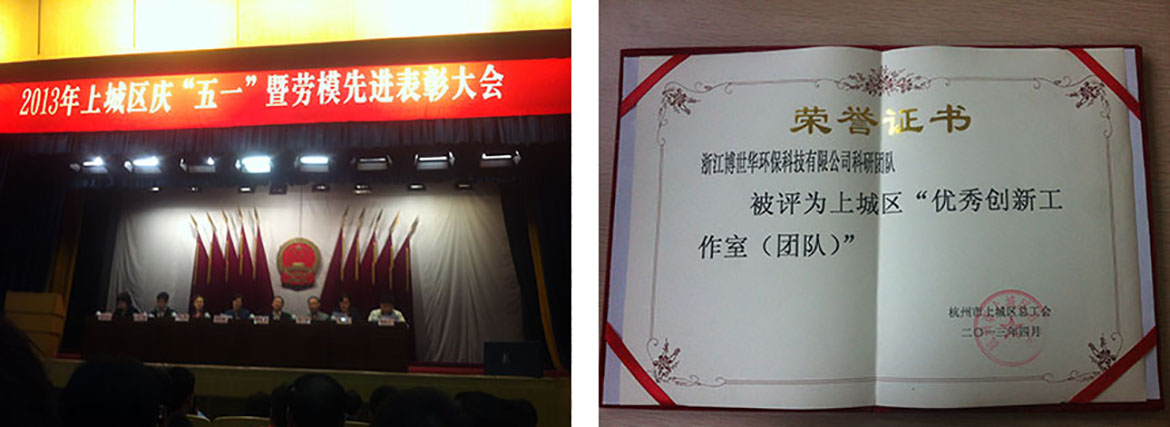2013年4月26日,在2013年上城區(qū)慶“五一”暨勞模先進表彰大會上,浙江博世華環(huán)保科技有限公司科研團隊,經(jīng)申報評議,被上城區(qū)總工會授予“上城區(qū)優(yōu)秀創(chuàng)新團隊”榮譽稱號。