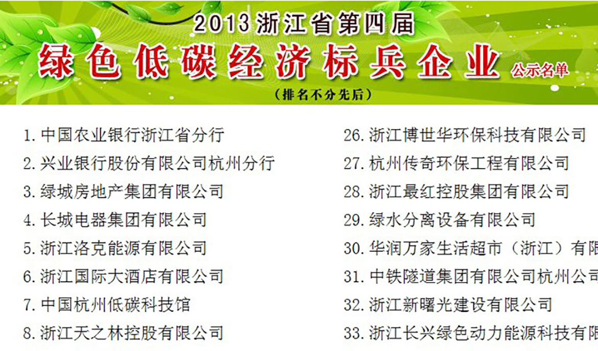 由錢江晚報、浙江在線新聞網(wǎng)站、浙江大學(xué)經(jīng)濟學(xué)院、浙江省企業(yè)發(fā)展研究會聯(lián)合主辦的浙江省第四屆“綠色低碳經(jīng)濟標(biāo)兵企業(yè)”評審會于2013年11月17日落幕,經(jīng)全體評委評審和無記名投票,在眾多入圍企業(yè)中選拔我省50家第四屆“綠色低碳經(jīng)濟標(biāo)兵企業(yè)”公示名單,我公司榮膺50家公示名單之內(nèi)。