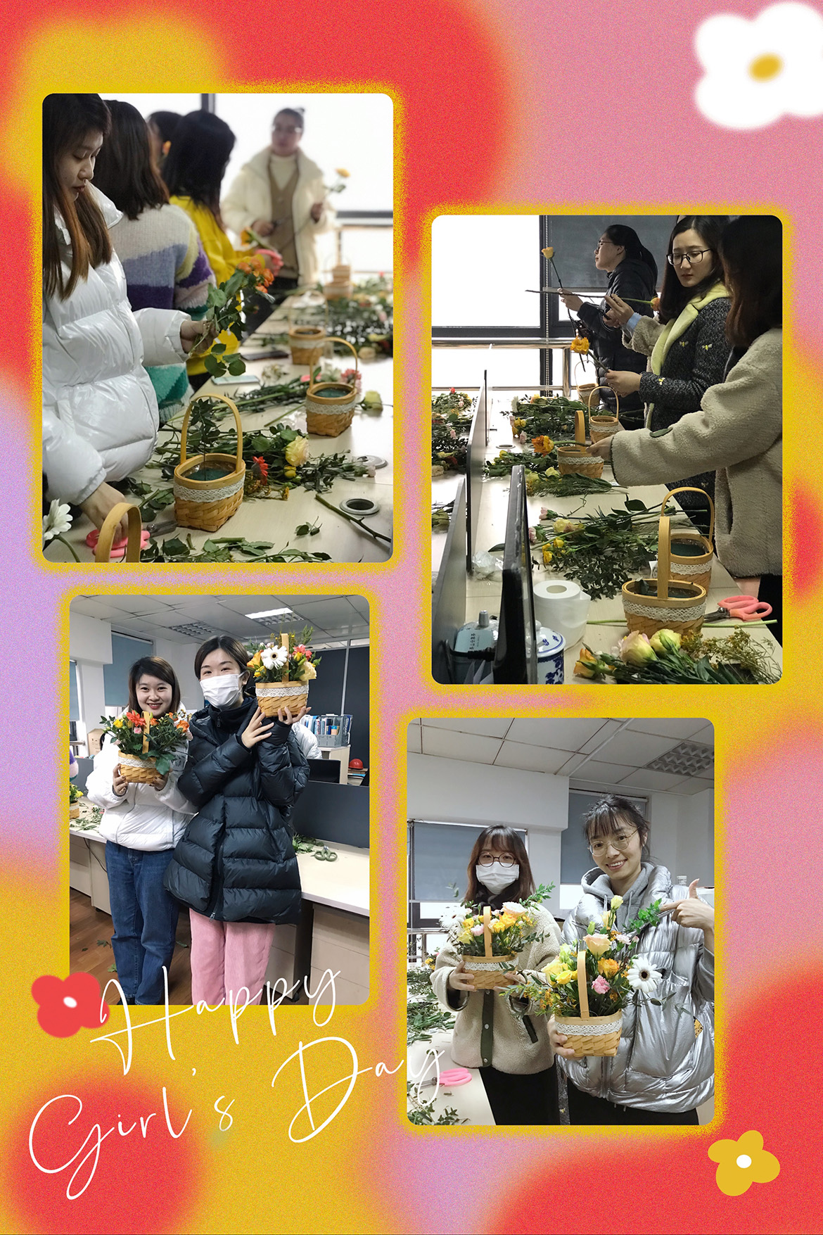 “女神”節(jié)到來,公司特意組織了插花,插花是一種高雅脫俗的藝術(shù)活動(dòng),它不僅可以美化環(huán)境、點(diǎn)綴氣氛,還可以提高品位與素養(yǎng)。經(jīng)驗(yàn)豐富的花藝師講解了花的花語和插花流程,女同胞們就紛紛動(dòng)起手來,每個(gè)人憑借對美的不同理解,認(rèn)真的修剪枝葉、設(shè)計(jì)造型,一籃籃錯(cuò)落有致、色彩鮮艷、造型優(yōu)美的插花作品就展現(xiàn)在了大家面前。每個(gè)人捧著自己親手制作的作品,反復(fù)欣賞著,跟自己的作品合影,一個(gè)個(gè)臉上洋溢著幸福感和成就感。
