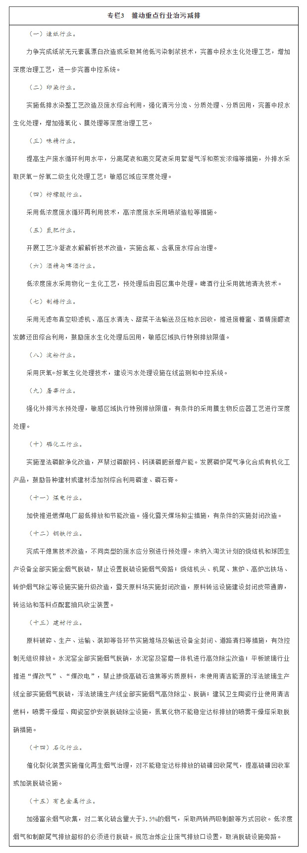 推動治污減排工程建設(shè)。各?。▍^(qū)、市)要制定實(shí)施造紙、印染等十大重點(diǎn)涉水行業(yè)專項(xiàng)治理方案,大幅降低污染物排放強(qiáng)度。電力、鋼鐵、紡織、造紙、石油石化、化工、食品發(fā)酵等高耗水行業(yè)達(dá)到先進(jìn)定額標(biāo)準(zhǔn)。以燃煤電廠超低排放改造為重點(diǎn),對電力、鋼鐵、建材、石化、有色金屬等重點(diǎn)行業(yè),實(shí)施綜合治理,對二氧化硫、氮氧化物、煙粉塵以及重金屬等多污染物實(shí)施協(xié)同控制。各省(區(qū)、市)應(yīng)于2017年底前制定專項(xiàng)治理方案并向社會公開,對治理不到位的工程項(xiàng)目要公開曝光。制定分行業(yè)治污技術(shù)政策,培育示范企業(yè)和示范工程。