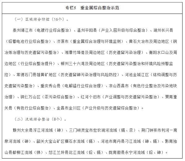 深化重點(diǎn)區(qū)域分類防控。重金屬污染防控重點(diǎn)區(qū)域制定實(shí)施重金屬污染綜合防治規(guī)劃,有效防控環(huán)境風(fēng)險(xiǎn)和改善區(qū)域環(huán)境質(zhì)量,分區(qū)指導(dǎo)、一區(qū)一策,實(shí)施差別化防控管理,加快湘江等流域、區(qū)域突出問題綜合整治,“十三五”期間,爭取20個(gè)左右地區(qū)退出重點(diǎn)區(qū)域。在江蘇靖江市、浙江平陽縣等16個(gè)重點(diǎn)區(qū)域和江西大余縣浮江河流域等8個(gè)流域開展重金屬污染綜合整治示范,探索建立區(qū)域和流域重金屬污染治理與風(fēng)險(xiǎn)防控的技術(shù)和管理體系。建立“錳三角”(錳礦開采和生產(chǎn)過程中存在嚴(yán)重環(huán)境污染問題的重慶市秀山縣、湖南省花垣縣、貴州省松桃縣三個(gè)縣)綜合防控協(xié)調(diào)機(jī)制,統(tǒng)一制定綜合整治規(guī)劃。優(yōu)化調(diào)整重點(diǎn)區(qū)域環(huán)境質(zhì)量監(jiān)測點(diǎn)位,2018年底前建成全國重金屬環(huán)境監(jiān)測體系。