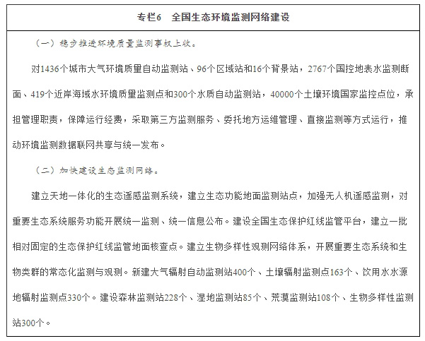 加強(qiáng)生態(tài)環(huán)境監(jiān)測網(wǎng)絡(luò)建設(shè)。統(tǒng)一規(guī)劃、優(yōu)化環(huán)境質(zhì)量監(jiān)測點(diǎn)位,建設(shè)涵蓋大氣、水、土壤、噪聲、輻射等要素,布局合理、功能完善的全國環(huán)境質(zhì)量監(jiān)測網(wǎng)絡(luò),實(shí)現(xiàn)生態(tài)環(huán)境監(jiān)測信息集成共享。大氣、地表水環(huán)境質(zhì)量監(jiān)測點(diǎn)位總體覆蓋80%左右的區(qū)縣,人口密集的區(qū)縣實(shí)現(xiàn)全覆蓋,土壤環(huán)境質(zhì)量監(jiān)測點(diǎn)位實(shí)現(xiàn)全覆蓋。提高大氣環(huán)境質(zhì)量預(yù)報(bào)和污染預(yù)警水平,強(qiáng)化污染源追蹤與解析,地級及以上城市開展大氣環(huán)境質(zhì)量預(yù)報(bào)。建設(shè)國家水質(zhì)監(jiān)測預(yù)警平臺。加強(qiáng)飲用水水源和土壤中持久性、生物富集性以及對人體健康危害大的污染物監(jiān)測。加強(qiáng)重點(diǎn)流域城鎮(zhèn)集中式飲用水水源水質(zhì)、水體放射性監(jiān)測和預(yù)警。建立天地一體化的生態(tài)遙感監(jiān)測系統(tǒng),實(shí)現(xiàn)環(huán)境衛(wèi)星組網(wǎng)運(yùn)行,加強(qiáng)無人機(jī)遙感監(jiān)測和地面生態(tài)監(jiān)測。構(gòu)建生物多樣性觀測網(wǎng)絡(luò)。